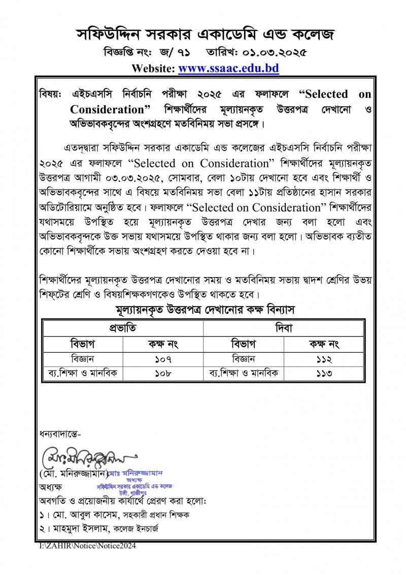এইচএসসি নির্বাচনি পরীক্ষা ২০২৫এর ফলাফলে ‘Selected on Consideration’ শিক্ষার্থীদের মূল্যায়নকৃত উত্তরপত্র দেখানো ও অভিভাবকবৃন্দের অংশগ্রহণে মতবিনিময় সভা প্রসঙ্গে। Published on Saturday, March 1, 2025