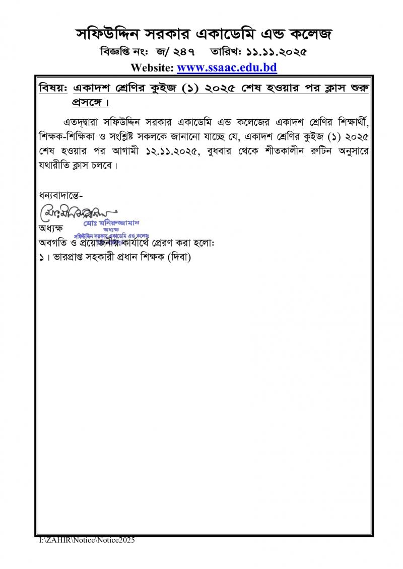 একাদশ শ্রেণির কুইজ (১) ২০২৫ শেষ হওয়ার পর ক্লাস শুরু প্রসঙ্গে। Published on Tuesday, November 11, 2025