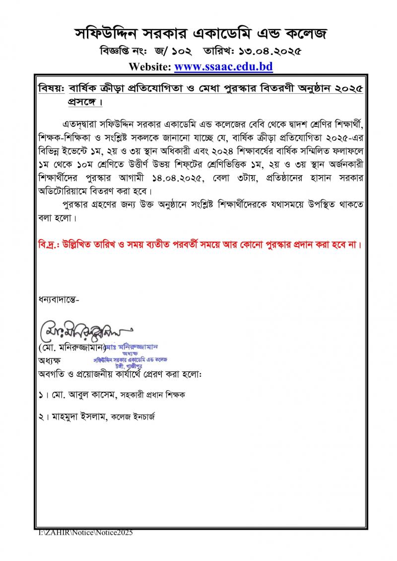 বার্ষিক ক্রীড়া প্রতিযোগিতা ও মেধা পুরস্কার বিতরণী অনুষ্ঠান ২০২৫ প্রসঙ্গে। Published on Sunday, April 13, 2025