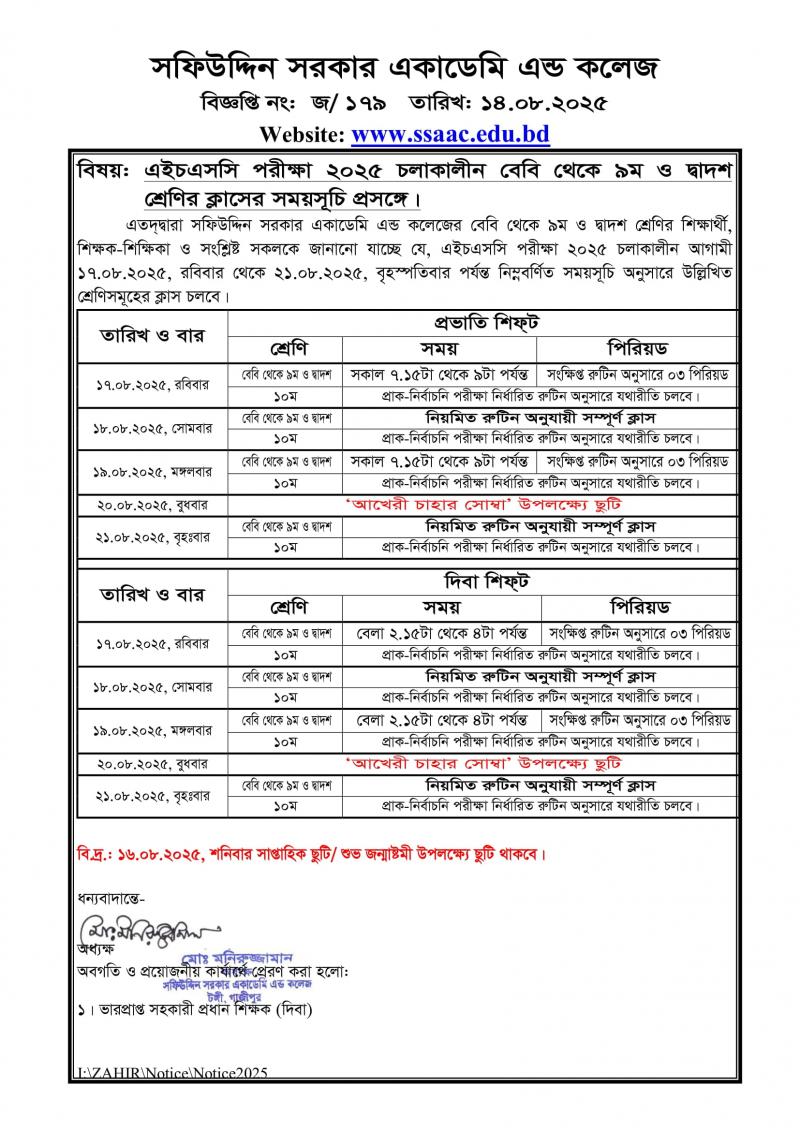 এইচএসসি পরীক্ষা ২০২৫ চলাকালীন বেবি থেকে ৯ম ও দ্বাদশ শ্রেণির ক্লাসের সময়সূচি প্রসঙ্গে। Published on Thursday, August 14, 2025