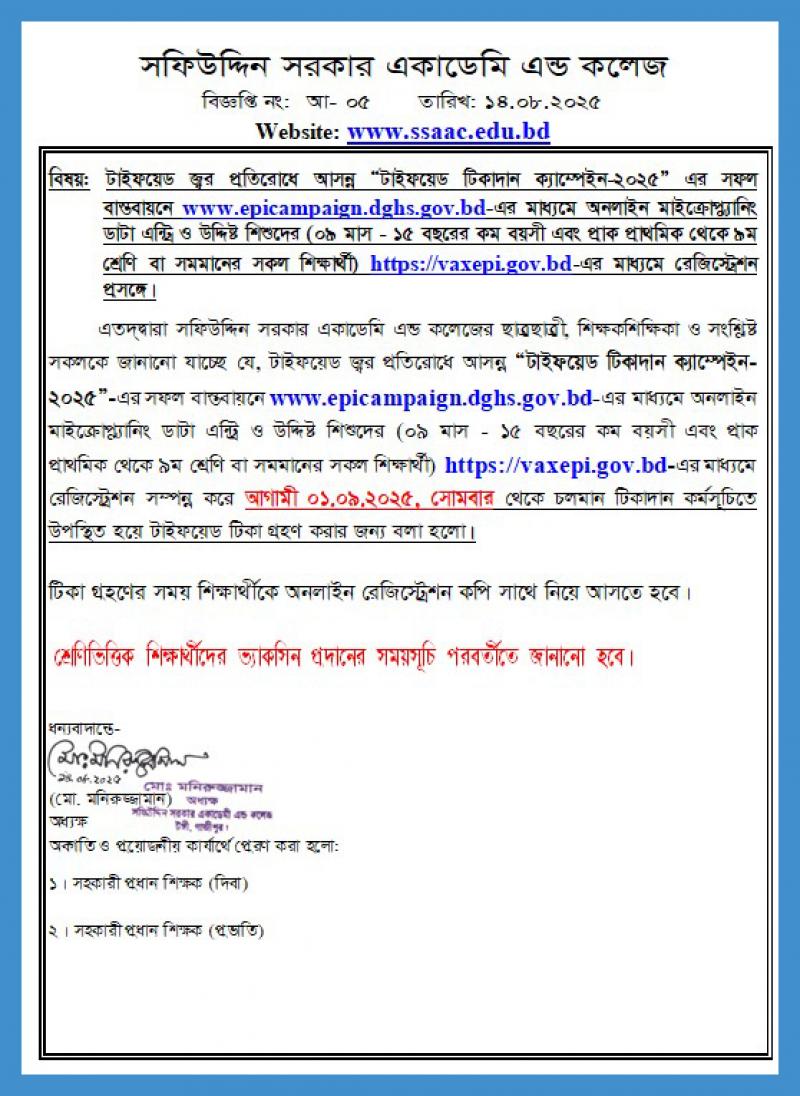 টাইফয়েড জ্বর প্রতিরোধে আসন্ন “ টাইফয়েড টিকাদান ক্যাম্পেইন-২০২৫” প্রসঙ্গে। Published on Thursday, August 14, 2025