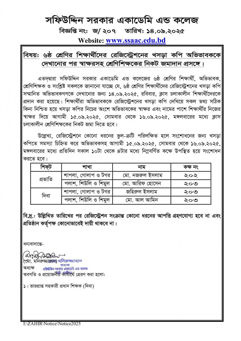 ৬ষ্ঠ শ্রেণির শিক্ষার্থীদের রেজিস্ট্রেশনের খসড়া কপি অভিভাবককে দেখানোর পর স্বাক্ষরসহ শ্রেণিশিক্ষকের নিকট জমাদান প্রসঙ্গে। Published on Sunday, September 14, 2025