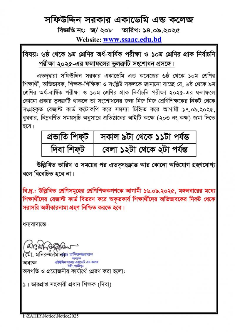 ৬ষ্ঠ থেকে ৯ম শ্রেণির অর্ধ-বার্ষিক পরীক্ষা ও ১০ম শ্রেণির প্রাক নির্বাচনি পরীক্ষা ২০২৫-এর ফলাফলের ভুলত্রুটি সংশোধন প্রসঙ্গে। Published on Sunday, September 14, 2025