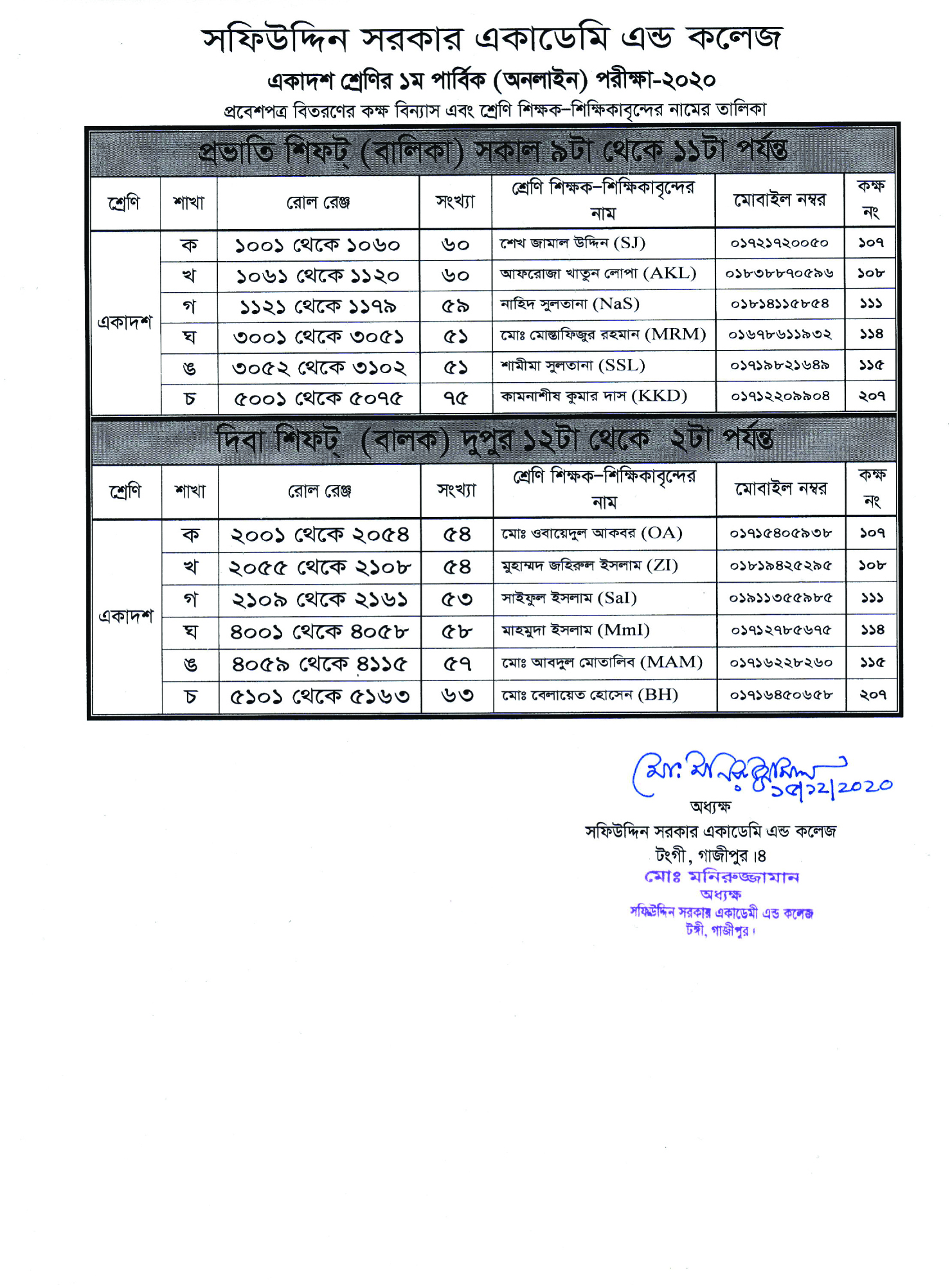 ২০২০-২১ শিক্ষাবর্ষের একাদশ শ্রেণির প্রবেশপত্র বিতরণের কক্ষ বিন্যাস ও শ্রেণি শিক্ষকের তালিকা Published on Tuesday, December 15, 2020