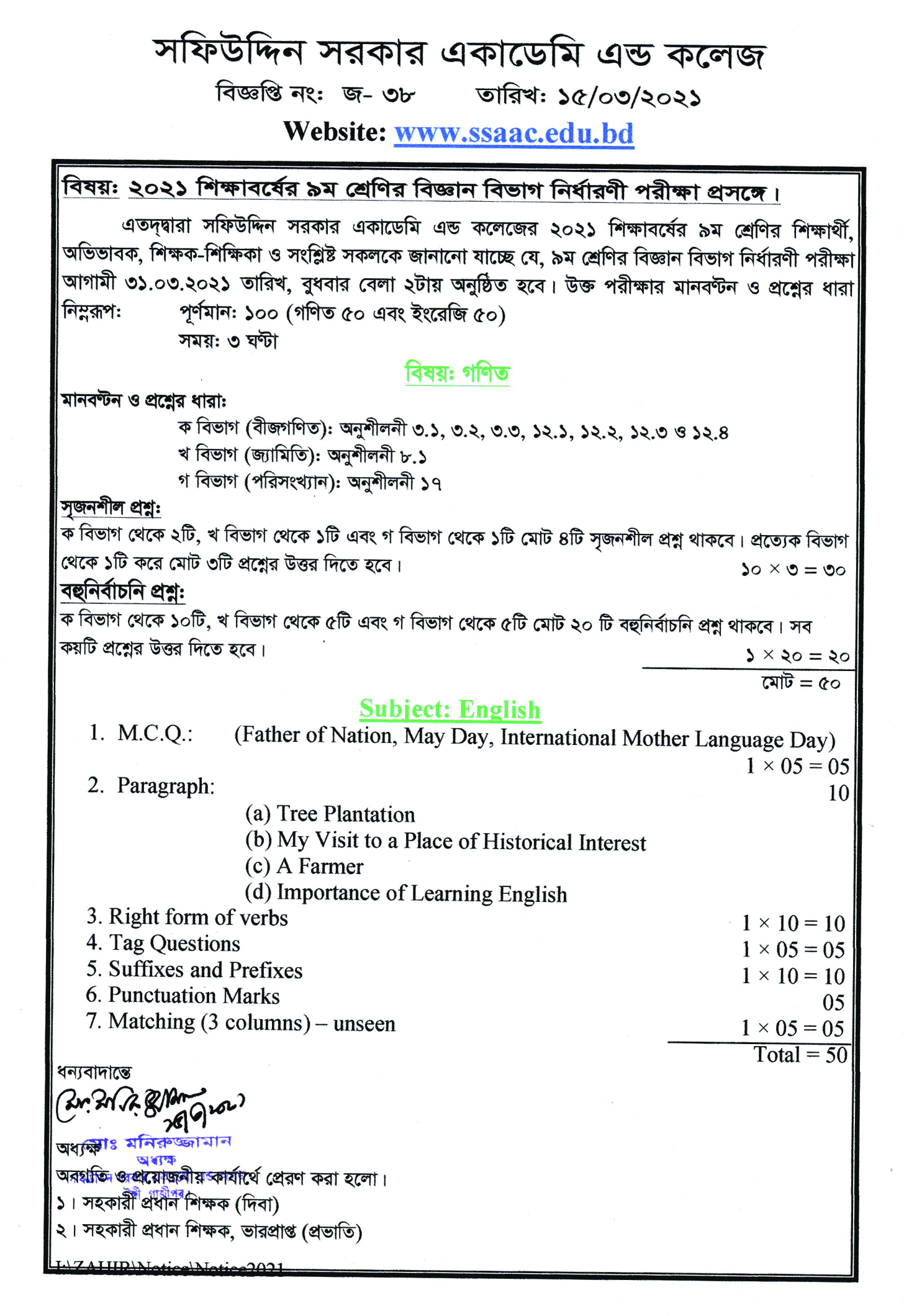 ২০২১ শিক্ষাবর্ষের ৯ম শ্রেণির বিজ্ঞান বিভাগ নির্ধারণী পরীক্ষা প্রসঙ্গে। Published on Tuesday, March 16, 2021