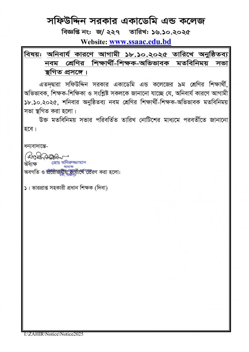 অনিবার্য কারণে আগামী ১৮.১০.২০২৫ তারিখে অনুষ্ঠিতব্য নবম শ্রেণির শিক্ষার্থী-শিক্ষক-অভিভাবক মতবিনিময় সভা স্থগিত প্রসঙ্গে। Published on Thursday, October 16, 2025