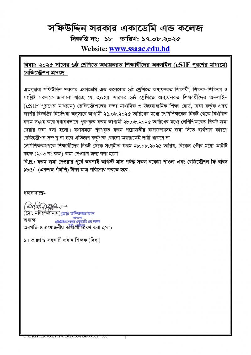 ২০২৫ শিক্ষাবর্ষের ৬ষ্ঠ শ্রেণির রেজিস্ট্রেশন প্রসঙ্গে। Published on Sunday, August 17, 2025