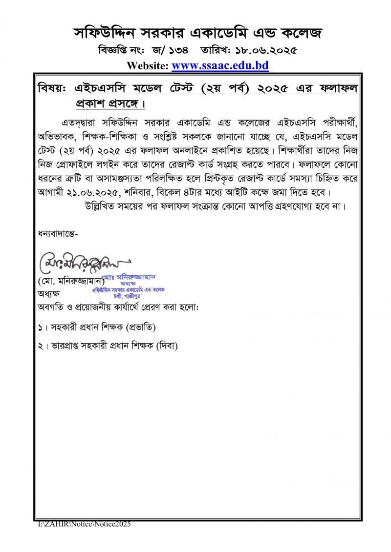 এইচএসসি মডেল টেস্ট (২য় পর্ব) ২০২৫ এর ফলাফল প্রকাশ প্রসঙ্গে। Published on Wednesday, June 18, 2025