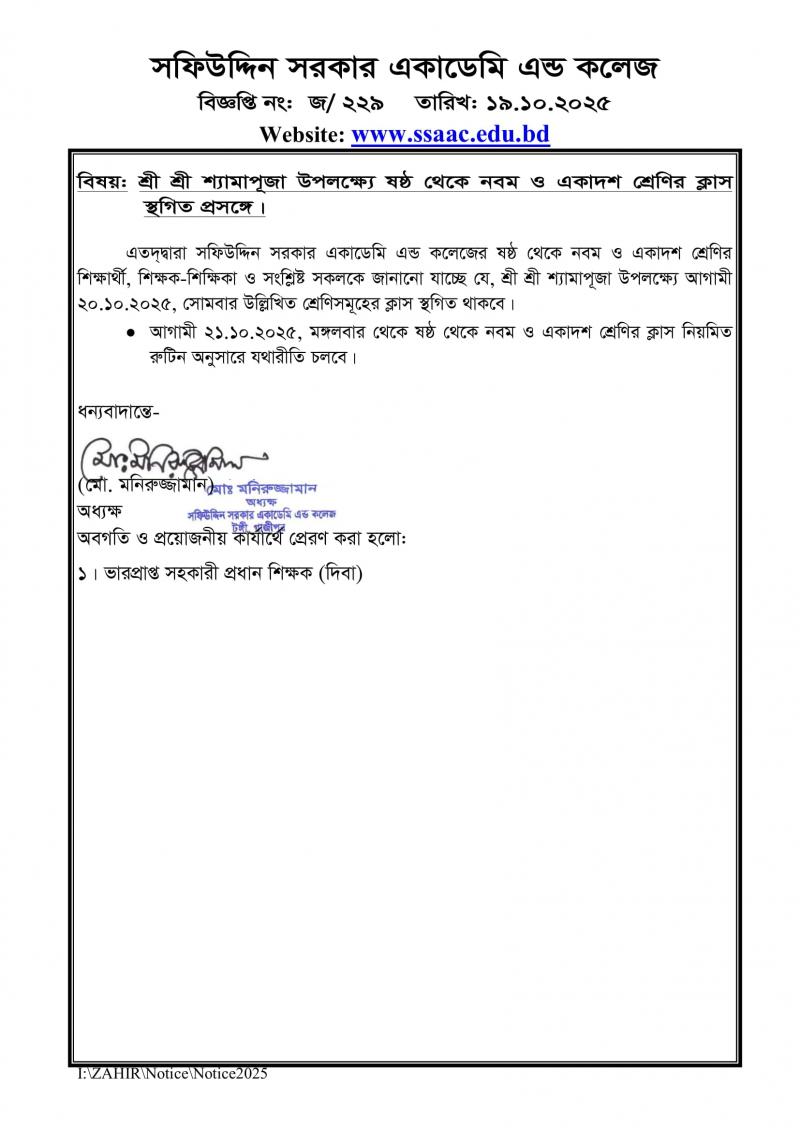 শ্রী শ্রী শ্যামাপূজা উপলক্ষ্যে ষষ্ঠ থেকে নবম ও একাদশ শ্রেণির ক্লাস স্থগিত প্রসঙ্গে। রবিবার, অক্টোবর ১৯, ২০২৫