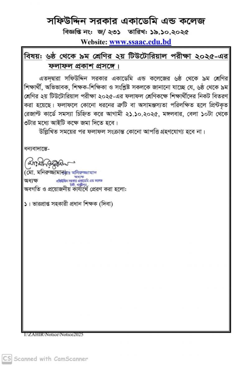 ৬ষ্ঠ থেকে ৯ম শ্রেণির ২য় টিউটোরিয়াল পরীক্ষা ২০২৫-এর ফলাফল প্রকাশ প্রসঙ্গে। রবিবার, অক্টোবর ১৯, ২০২৫