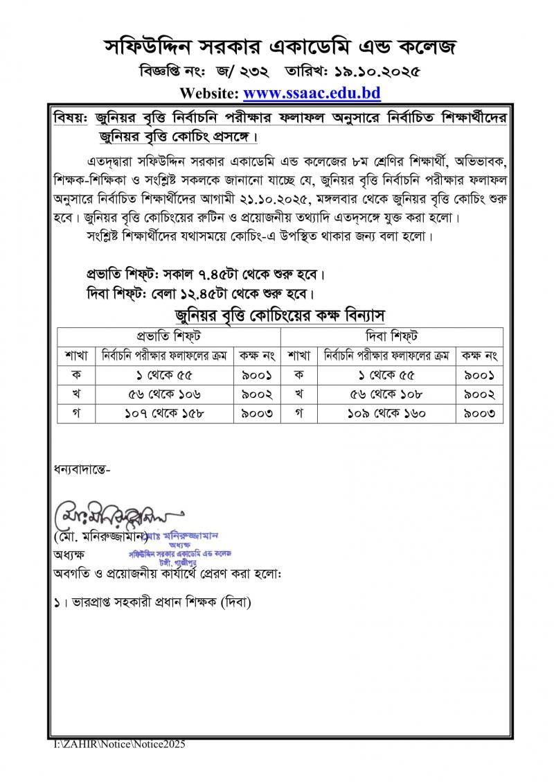 জুনিয়র বৃত্তি নির্বাচনি পরীক্ষার ফলাফল অনুসারে নির্বাচিত শিক্ষার্থীদের জুনিয়র বৃত্তি কোচিং প্রসঙ্গে। Published on Sunday, October 19, 2025