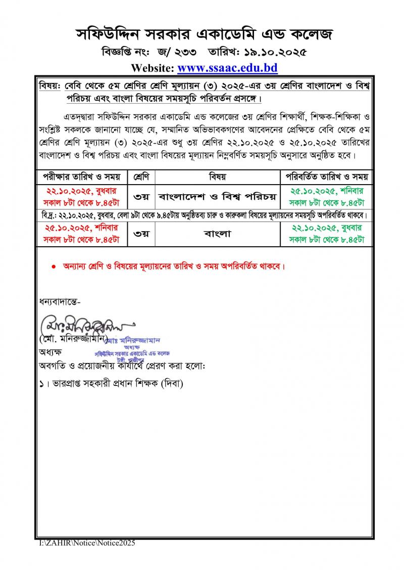 বেবি থেকে ৫ম শ্রেণির শ্রেণি মূল্যায়ন (৩) ২০২৫-এর ৩য় শ্রেণির বাংলাদেশ ও বিশ্ব পরিচয় এবং বাংলা বিষয়ের সময়সূচি পরিবর্তন প্রসঙ্গে। Published on Sunday, October 19, 2025