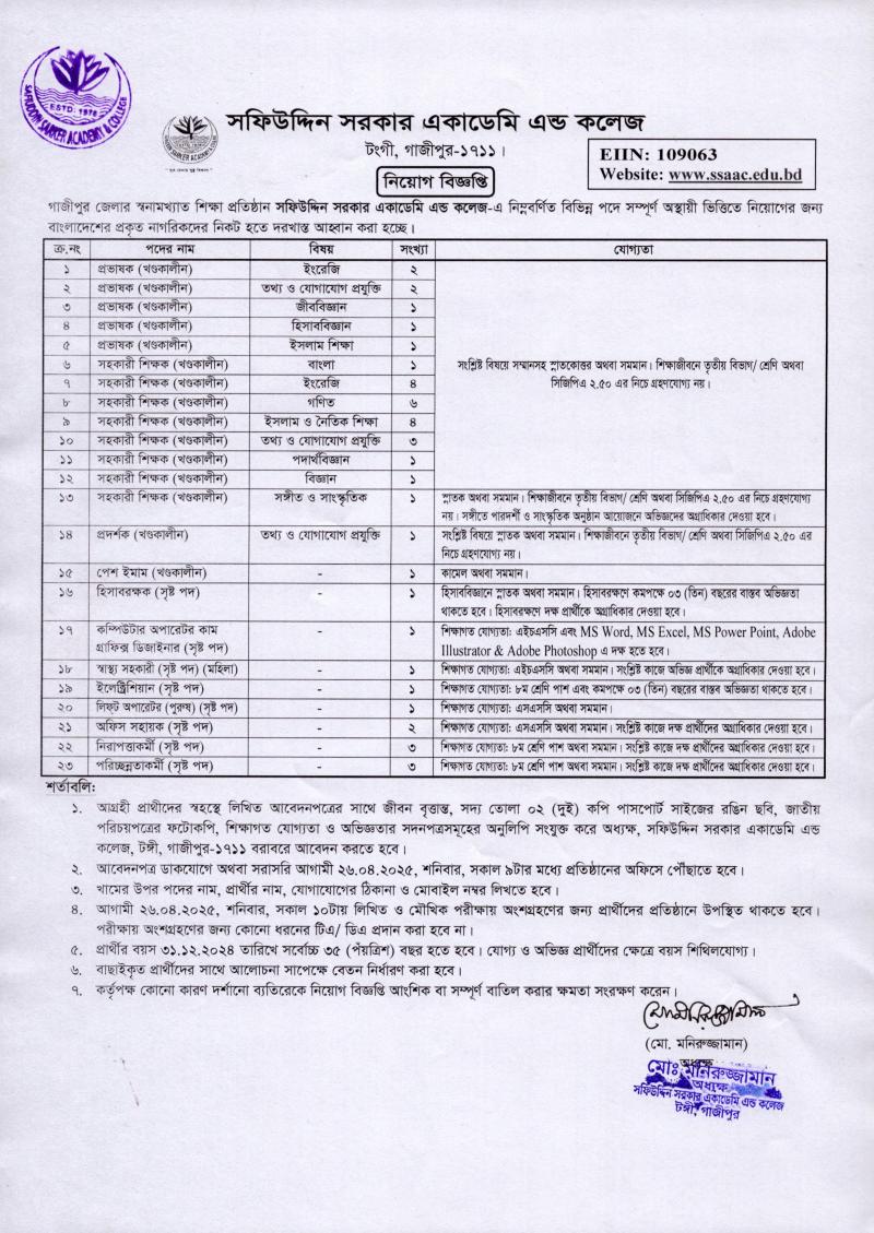 সফিউদ্দিন সরকার একাডেমি এন্ড কলেজ-এ বিভিন্ন পদে সম্পূর্ণ অস্থায়ী ভিত্তিতে নিয়োগ বিজ্ঞপ্তি ২০২৫ Published on Sunday, April 20, 2025