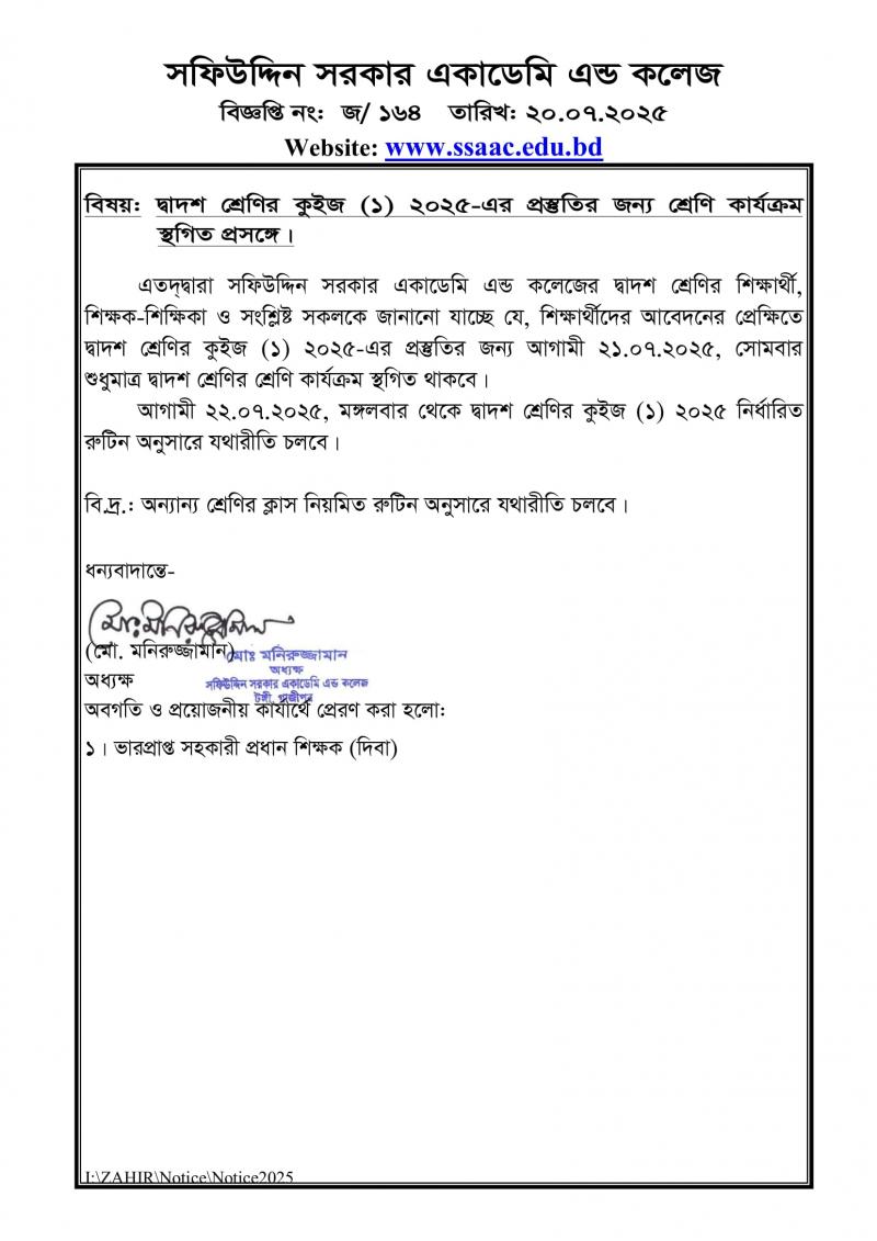 দ্বাদশ শ্রেণির কুইজ (১) ২০২৫-এর প্রস্তুতির জন্য শ্রেণি কার্যক্রম স্থগিত প্রসঙ্গে। Published on Sunday, July 20, 2025