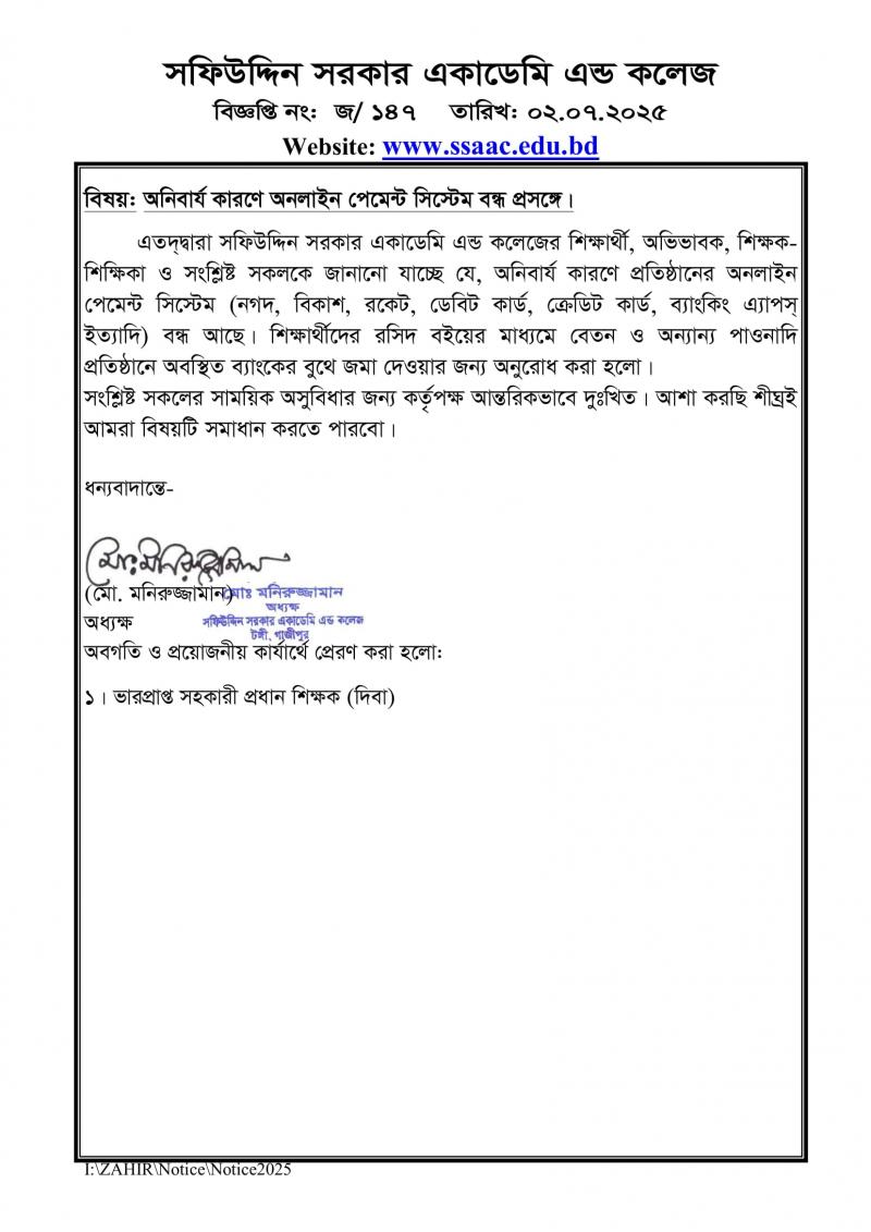 অনিবার্য কারণে অনলাইন পেমেন্ট সিস্টেম বন্ধ প্রসঙ্গে। Published on Wednesday, July 2, 2025