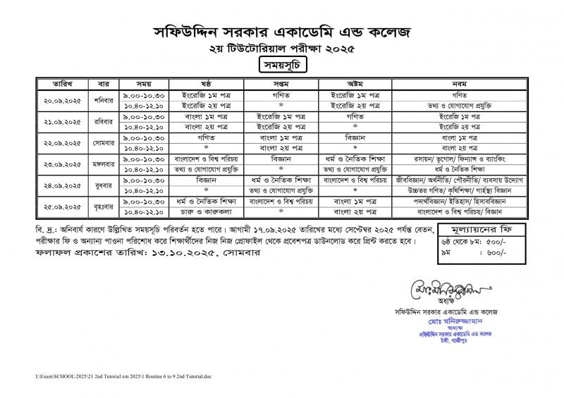 ৬ষ্ঠ থেকে ৯ম শ্রেণির ২য় টিউটোরিয়াল পরীক্ষা ২০২৫ এর সমযসূচি Published on Tuesday, September 2, 2025
