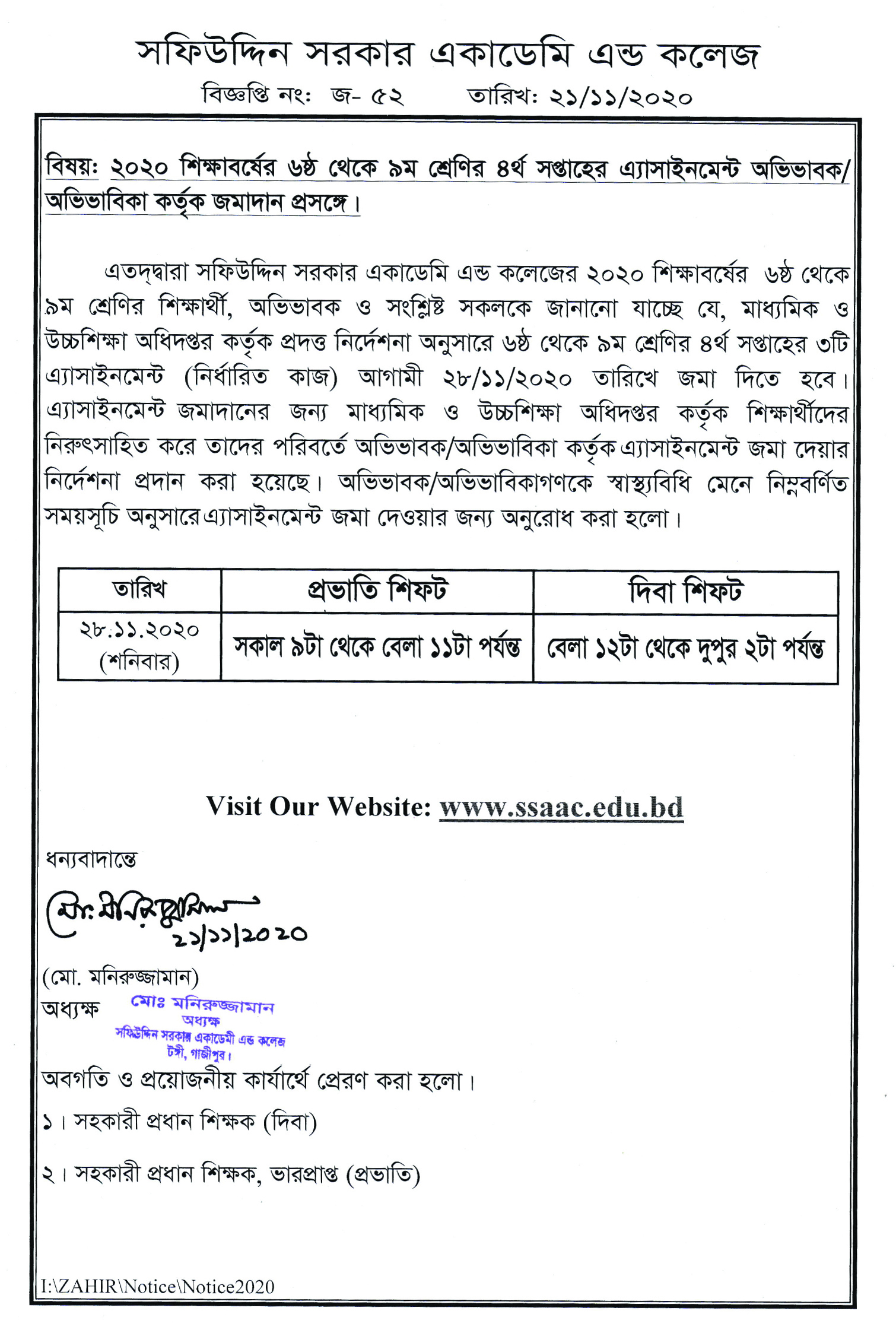 ২০২০ শিক্ষাবর্ষের ৬ষ্ঠ থেকে ৯ম শ্রেণির ৪র্থ সপ্তাহের এ্যাসাইনমেন্ট অভিভাবক/ অভিভাবিকা কর্তৃক জমাদান প্রসঙ্গে। Published on Saturday, November 21, 2020