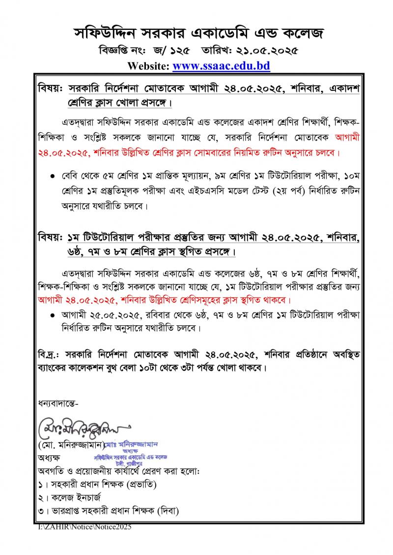 সরকারি নির্দেশনা মোতাবেক আগামী ২৪.০৫.২০২৫, শনিবার, একাদশ শ্রেণির ক্লাস খোলা প্রসঙ্গে। Published on Thursday, May 22, 2025