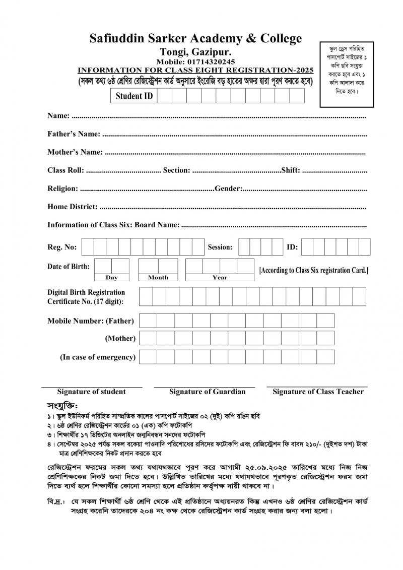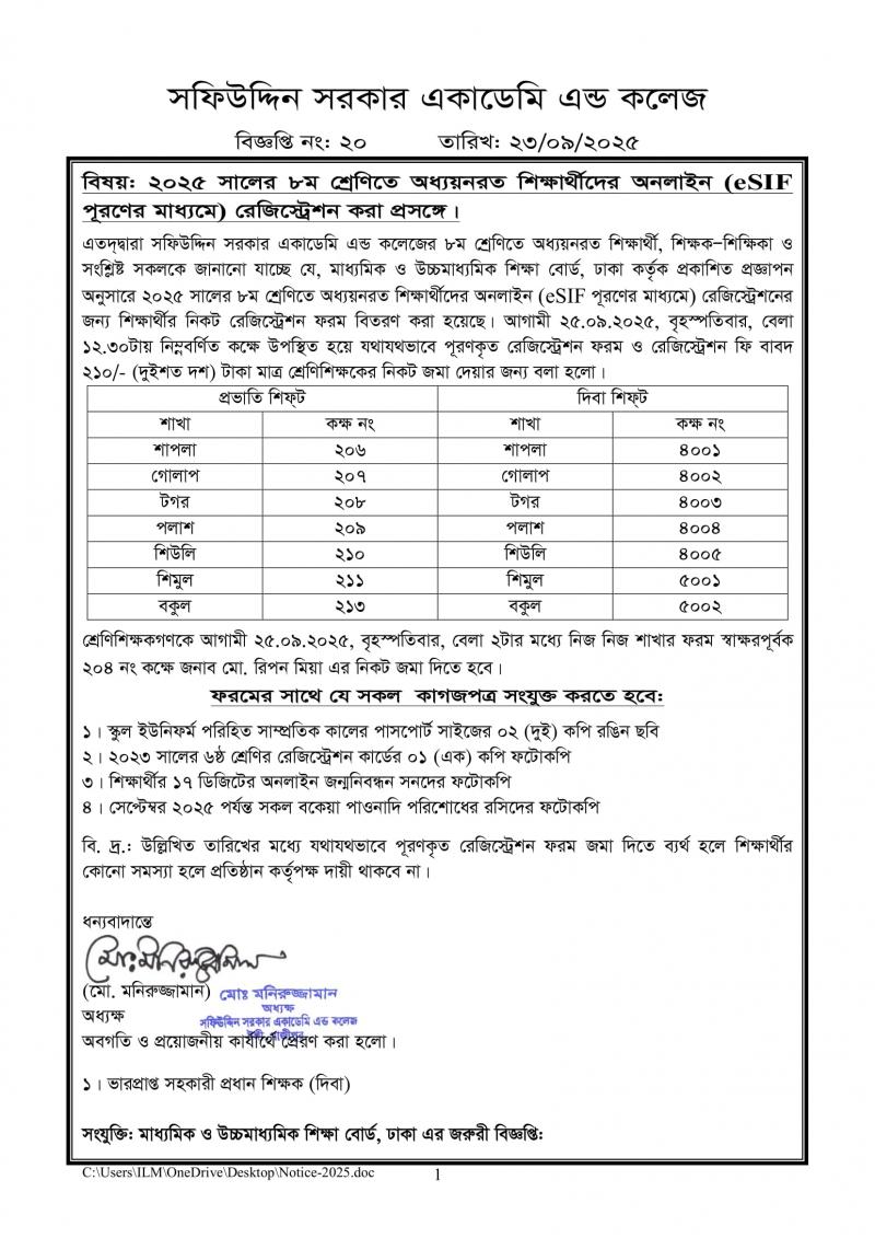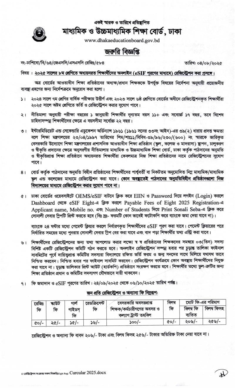 ২০২৫ শিক্ষাবর্ষের ৮ম শ্রেণির শিক্ষার্থীদের রেজিস্ট্রেশন প্রসঙ্গে। Published on Wednesday, September 24, 2025