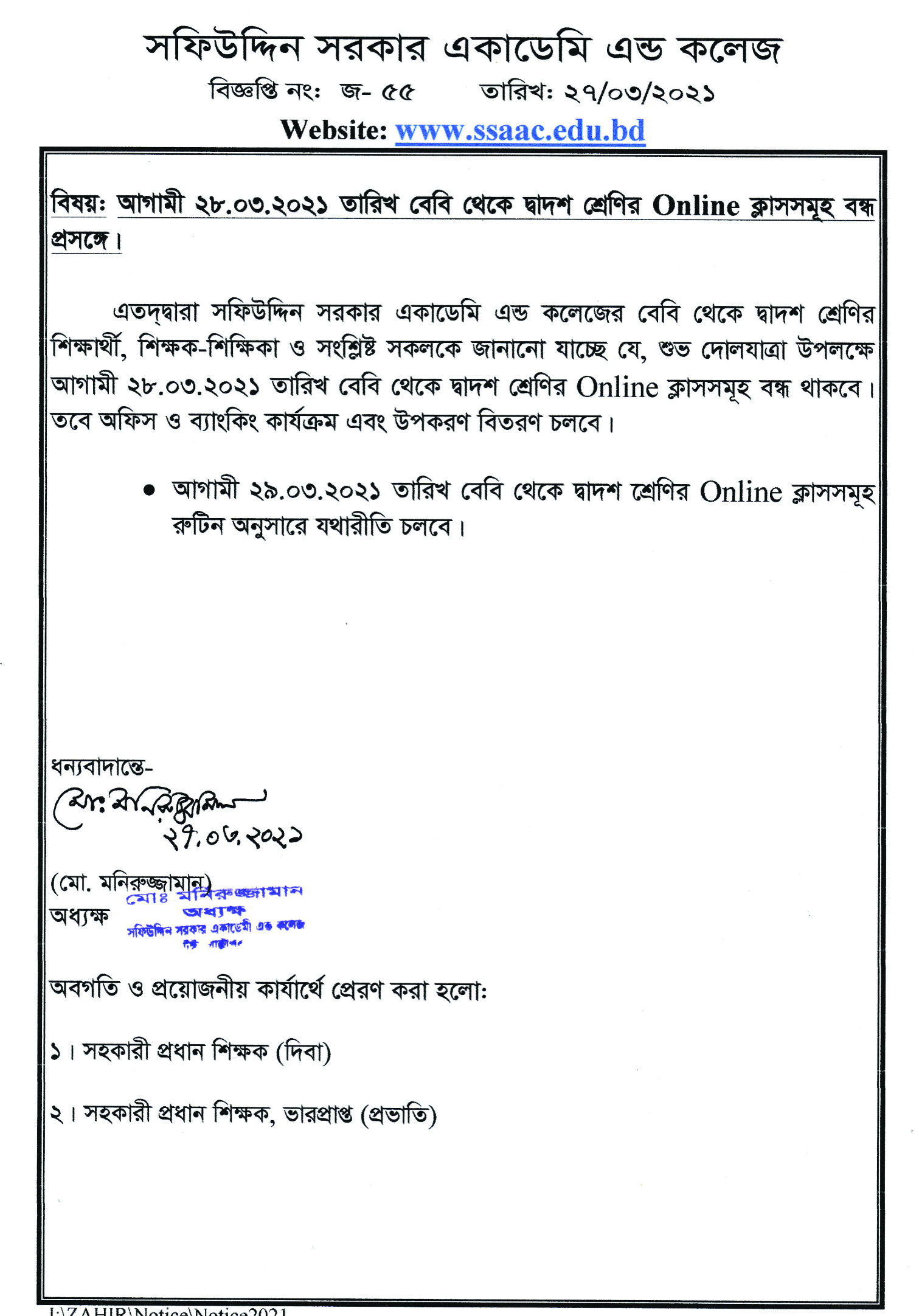 আগামী ২৮.০৩.২০২১ তারিখ বেবি থেকে দ্বাদশ শ্রেণির Online ক্লাসসমূহ বন্ধ প্রসঙ্গে। Published on Saturday, March 27, 2021