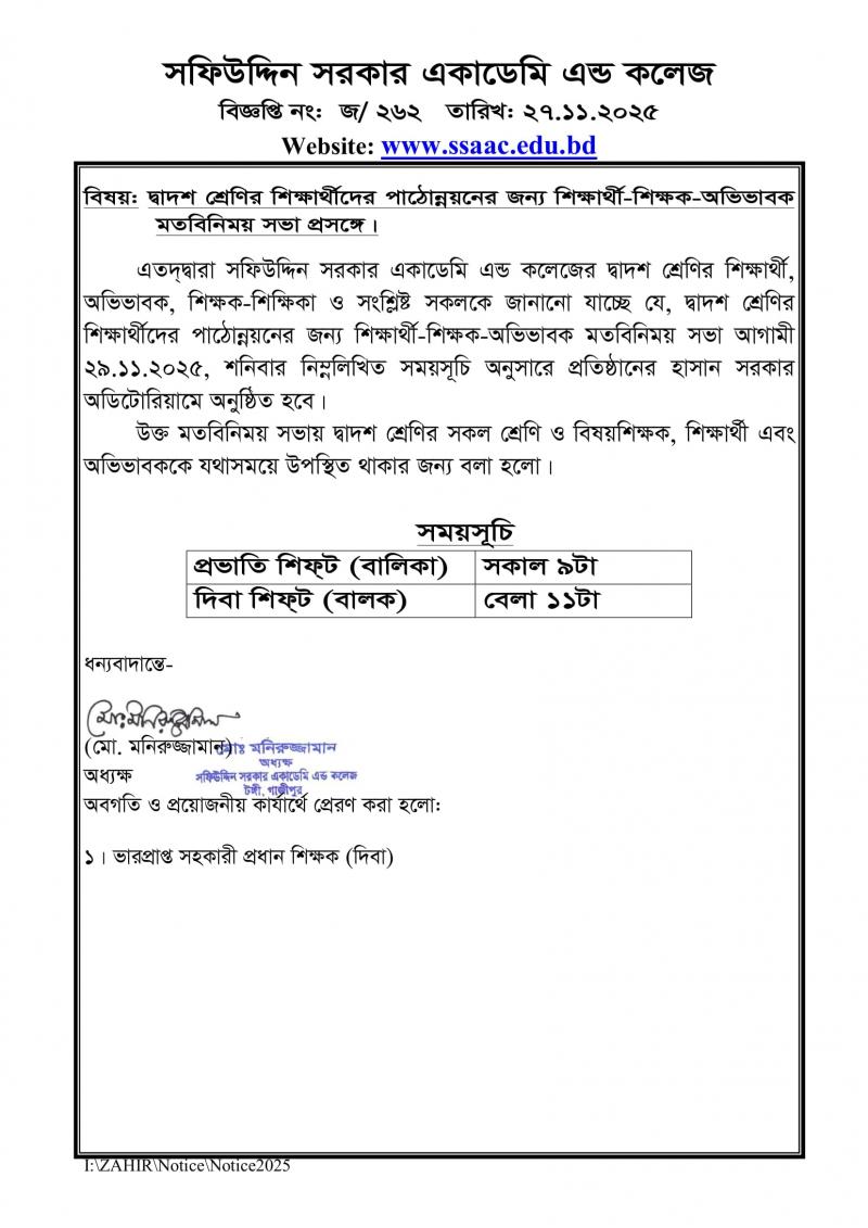 দ্বাদশ শ্রেণির শিক্ষার্থীদের পাঠোন্নয়নের জন্য শিক্ষার্থী-শিক্ষক-অভিভাবক মতবিনিময় সভা প্রসঙ্গে। বৃহস্পতিবার, নভেম্বর ২৭, ২০২৫