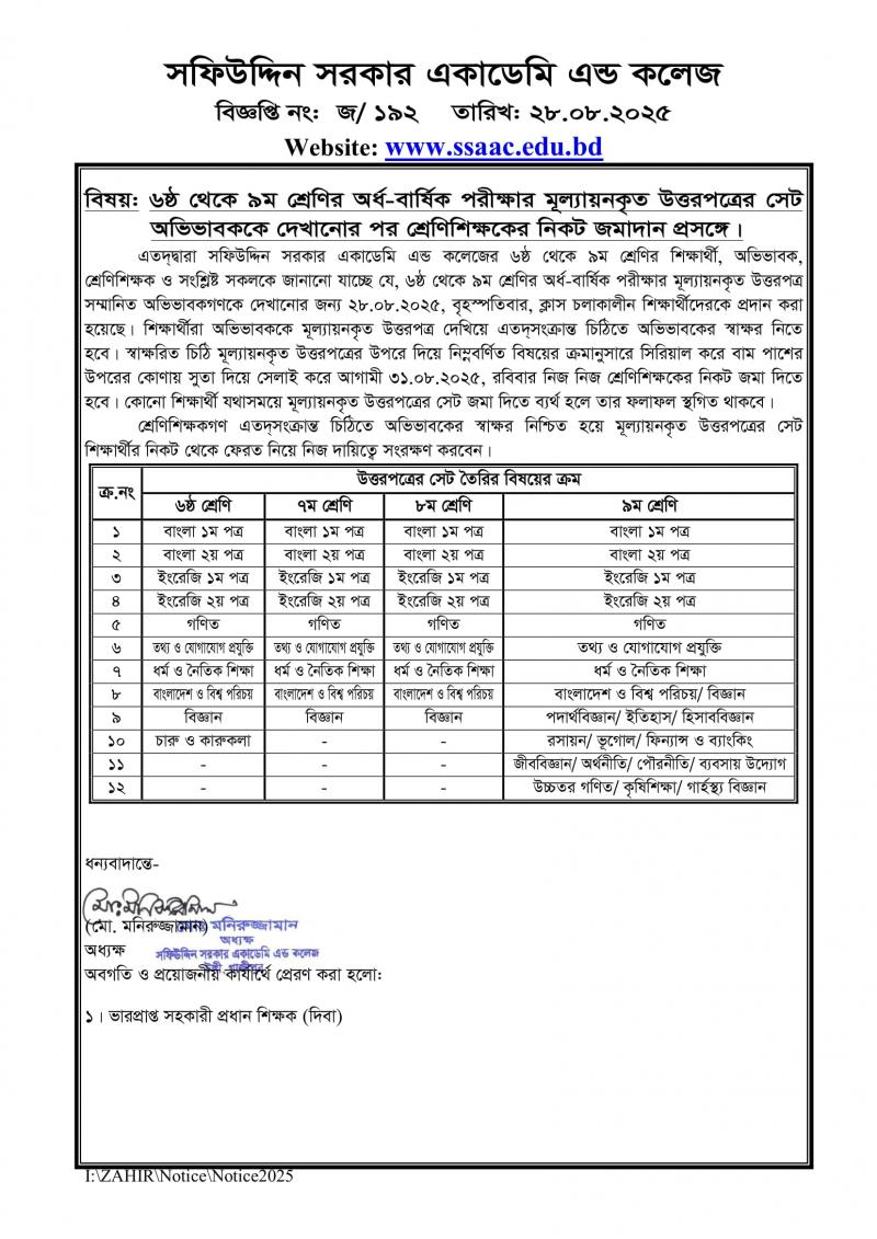 ৬ষ্ঠ থেকে ৯ম শ্রেণির অর্ধ-বার্ষিক পরীক্ষার মূল্যায়নকৃত উত্তরপত্রের সেট অভিভাবককে দেখানোর পর শ্রেণিশিক্ষকের নিকট জমাদান প্রসঙ্গে। Published on Thursday, August 28, 2025
