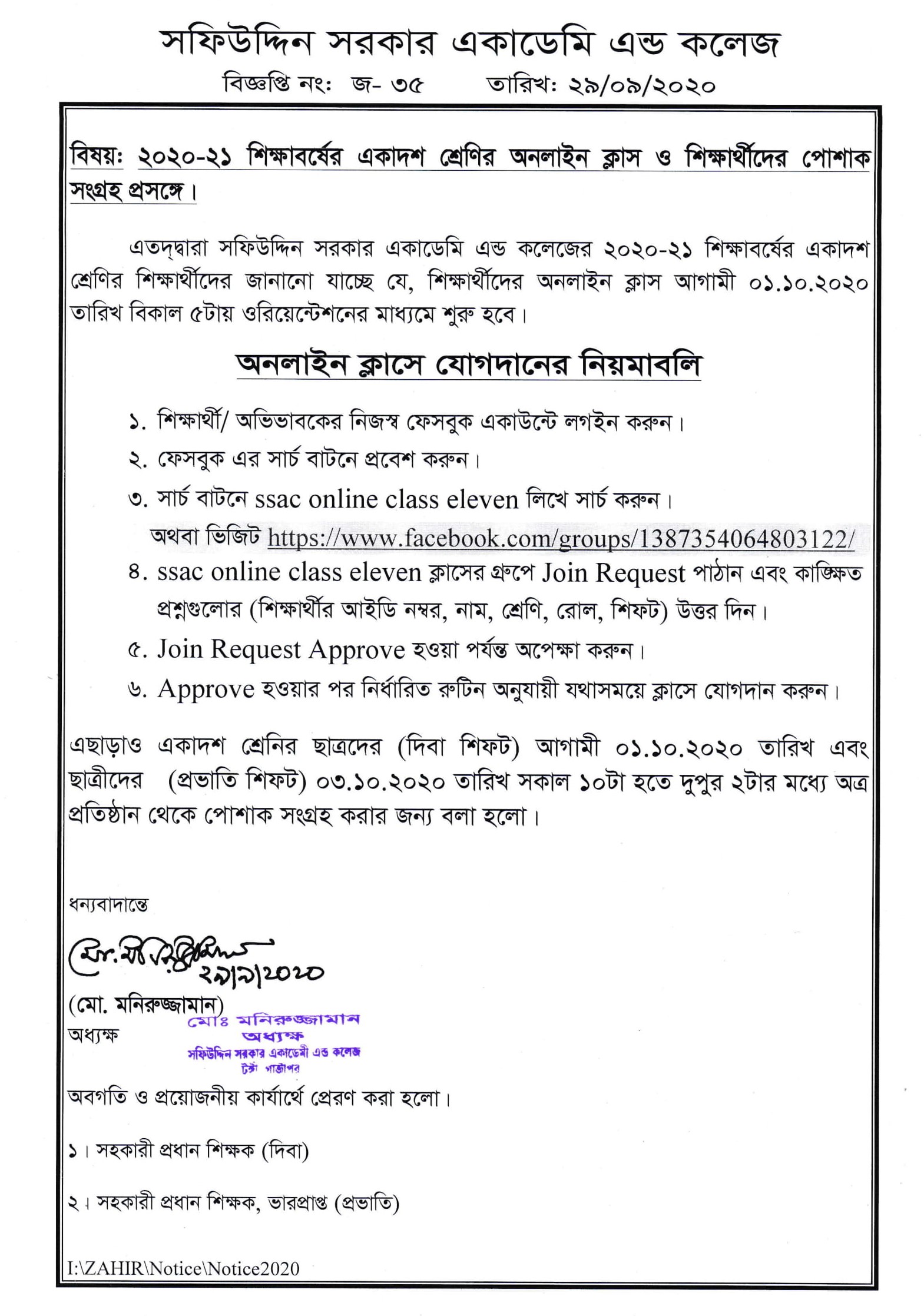 ২০২০-২১ শিক্ষাবর্ষের একাদশ শ্রেণির অনলাইন ক্লাস ও শিক্ষার্থীদের পোশাক সংগ্রহ প্রসঙ্গে Published on Tuesday, September 29, 2020