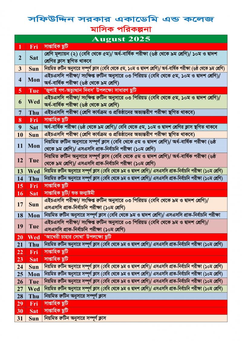 আগস্ট ২০২৫-এর মাসিক পরিকল্পনা Published on Thursday, July 31, 2025