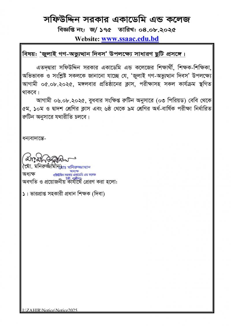 ‘জুলাই গণ-অভ্যুত্থান দিবস’ উপলক্ষ্যে সাধারণ ছুটি প্রসঙ্গে। Published on Monday, August 4, 2025