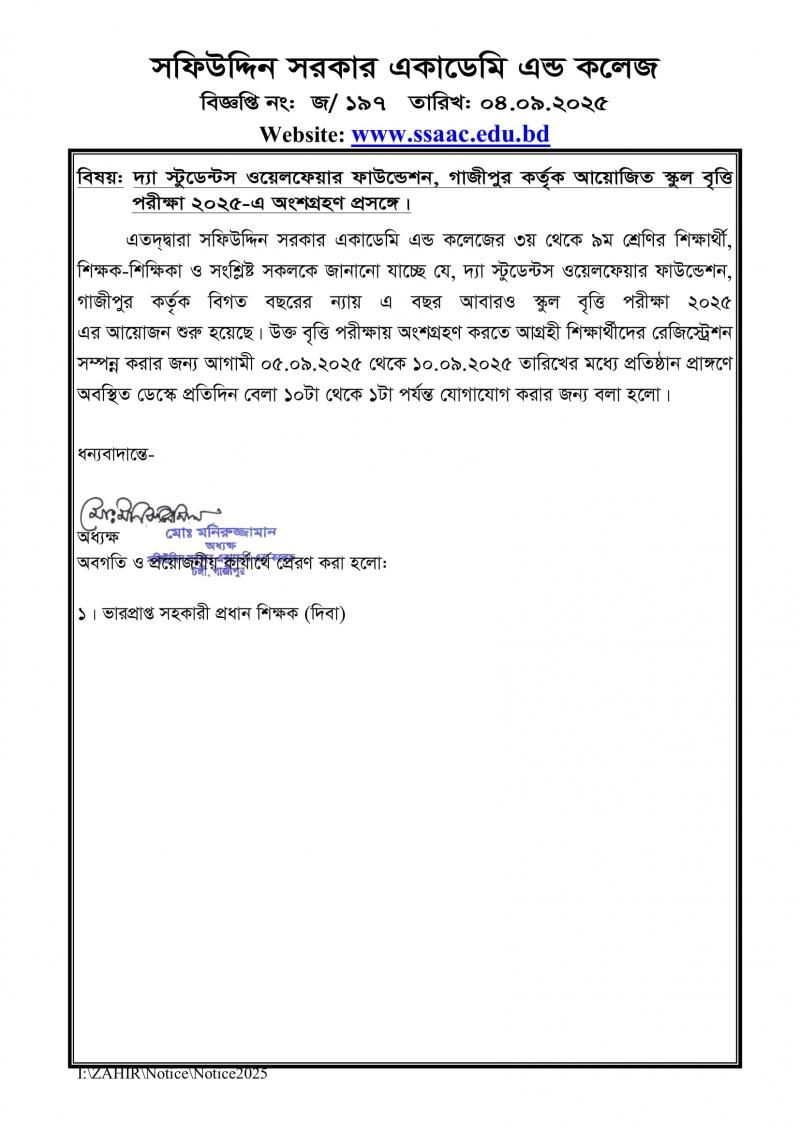 দ্যা স্টুডেন্টস ওয়েলফেয়ার ফাউন্ডেশন, গাজীপুর কর্তৃক আয়োজিত স্কুল বৃত্তি পরীক্ষা ২০২৫-এ অংশগ্রহণ প্রসঙ্গে। Published on Thursday, September 4, 2025