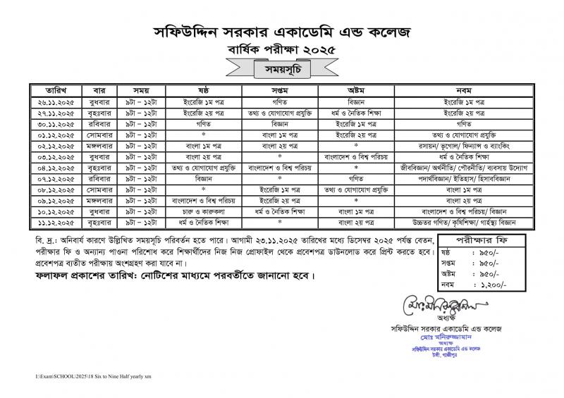 ৬ষ্ঠ থেকে ৯ম শ্রেণির বার্ষিক পরীক্ষা ২০২৫ এর সময়সূচি Published on Tuesday, November 4, 2025