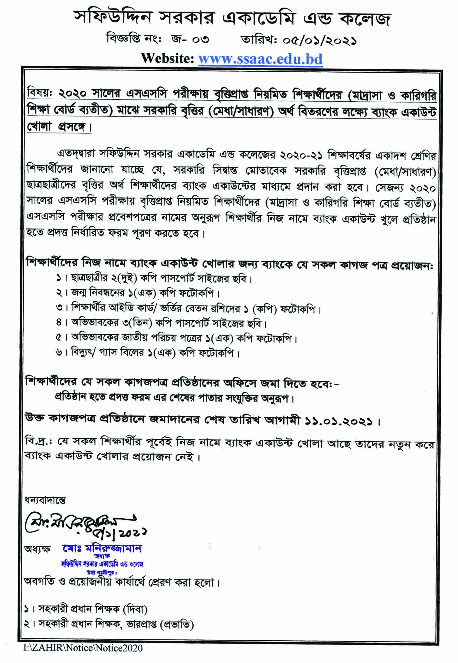 ২০২০ সালের এসএসসি পরীক্ষায় বৃত্তিপ্রাপ্ত নিয়মিত শিক্ষার্থীদের (মাদ্রাসা ও কারিগরি শিক্ষা বোর্ড ব্যতীত) মাঝে সরকারি বৃত্তির (মেধা/সাধারণ) অর্থ বিতরণের লক্ষ্যে ব্যাংক একাউন্ট খোলা প্রসঙ্গে। Published on Tuesday, January 5, 2021