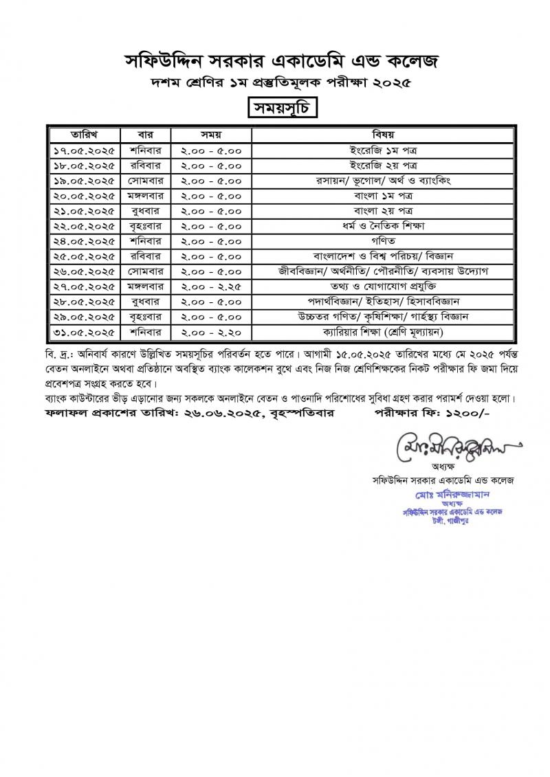 দশম শ্রেণির ১ম প্রস্তুতিমূলক পরীক্ষা ২০২৫ এর সময়সূচি Published on Wednesday, May 7, 2025