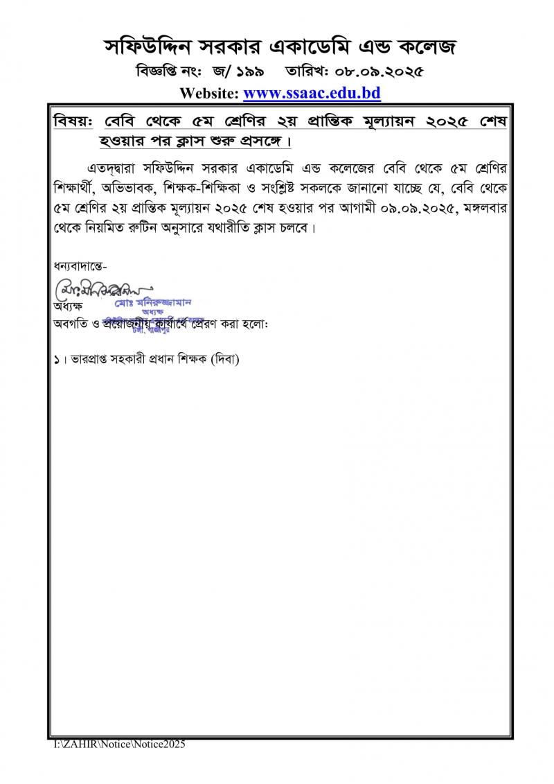 বেবি থেকে ৫ম শ্রেণির ২য় প্রান্তিক মূল্যায়ন ২০২৫ শেষ হওয়ার পর ক্লাস শুরু প্রসঙ্গে। Published on Monday, September 8, 2025