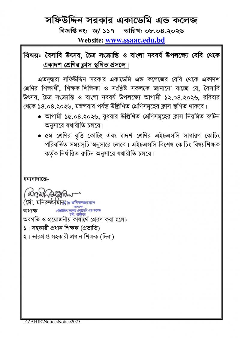 বৈসাবি উৎসব, চৈত্র সংক্রান্তি ও বাংলা নববর্ষ উপলক্ষ্যে বেবি থেকে একাদশ শ্রেণির ক্লাস স্থগিত প্রসঙ্গে। বৃহস্পতিবার, এপ্রিল ৯, ২০২৬
